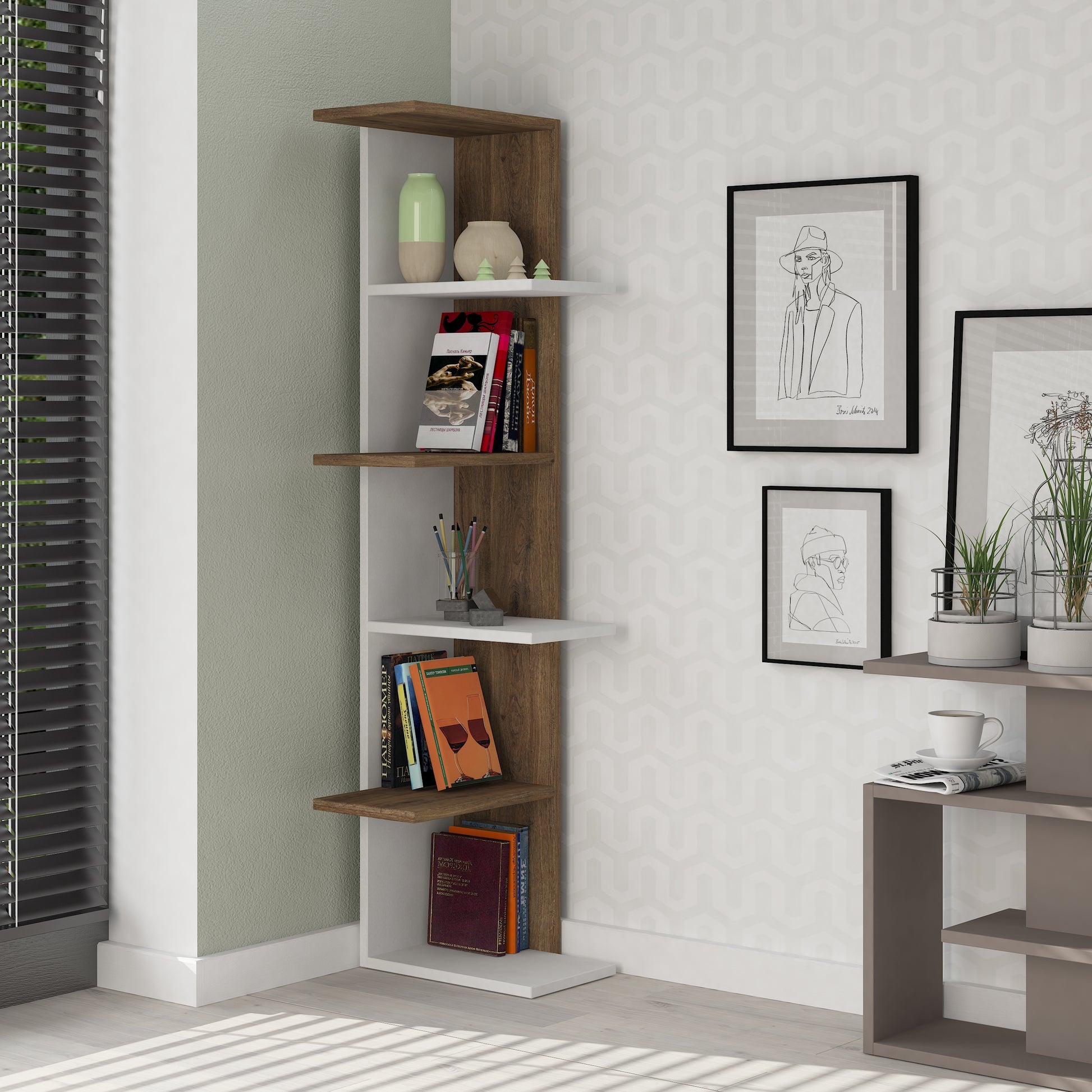 Revitalize your living space with the Haab Corner Bookcase and unlock the hidden potential of your corners. Embrace the beauty of functionality and design as this bookcase becomes a captivating centerpiece, showcasing your cherished items while adding a touch of charm to your home.