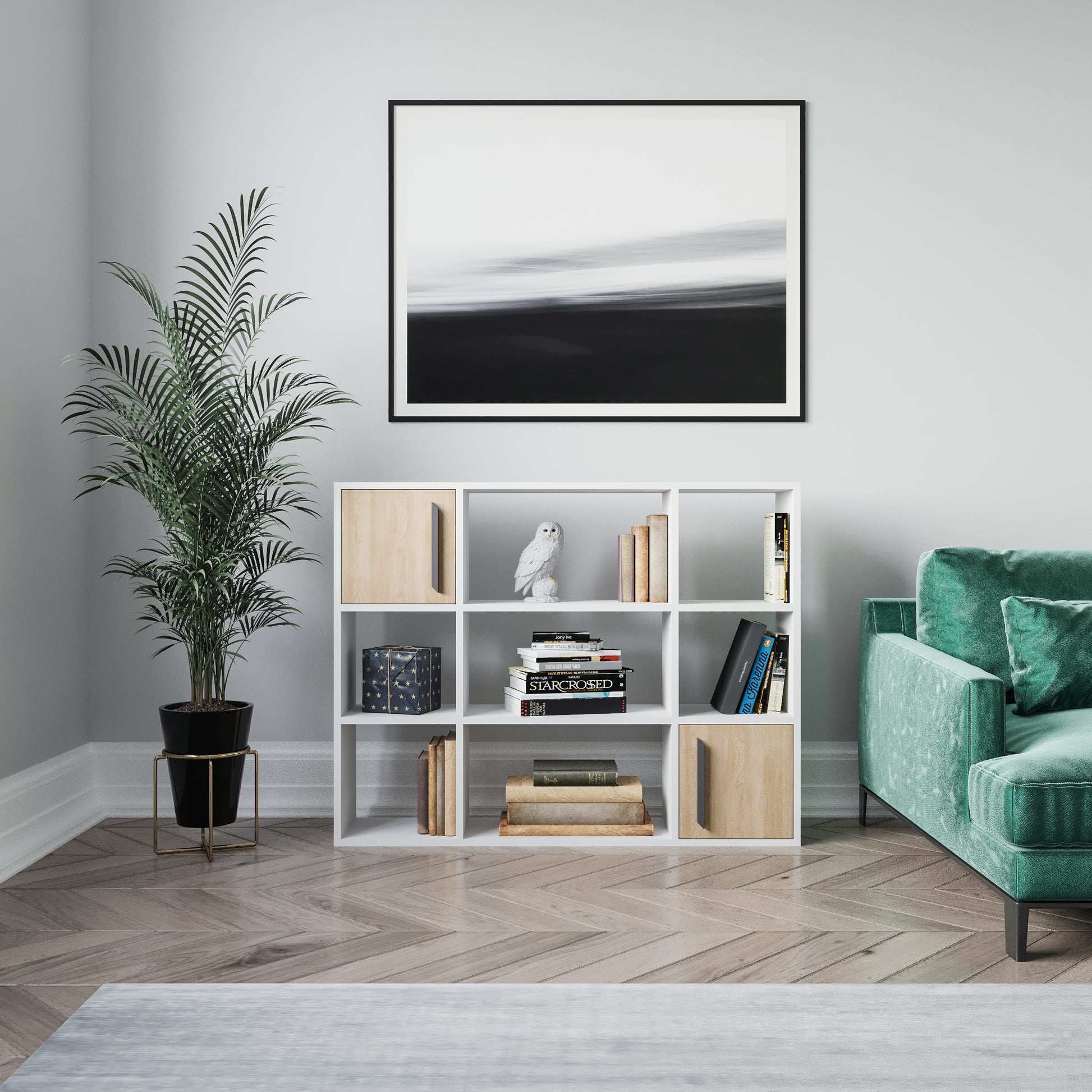 Versatile and multi-functional design for use as a bookshelf, vertical shelf, office shelf, kitchen shelf, room divider, or corridor shelf.