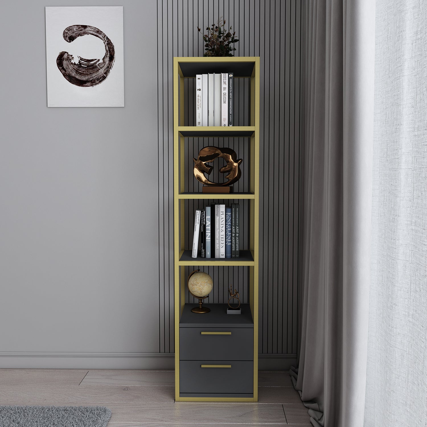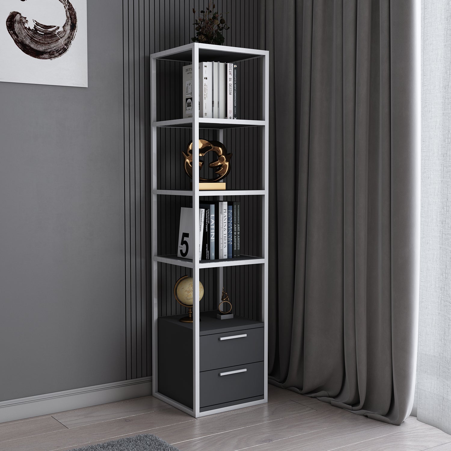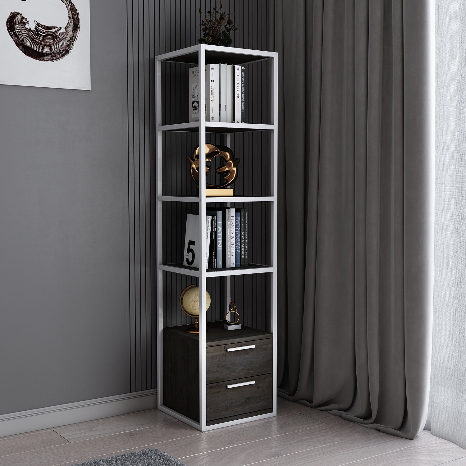 Stylish and modern, this bookcase is an eye-catching addition to any home. A sturdy steel frame creates visual interest that can be paired with a variety of decor. The bookcases open shelves are perfect for display and organization without overwhelming the room.